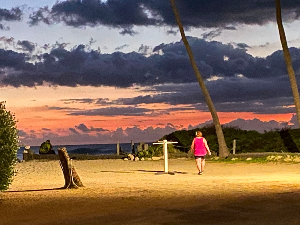 Jenna walks into the sunset towards the waves crashing on the beach.
