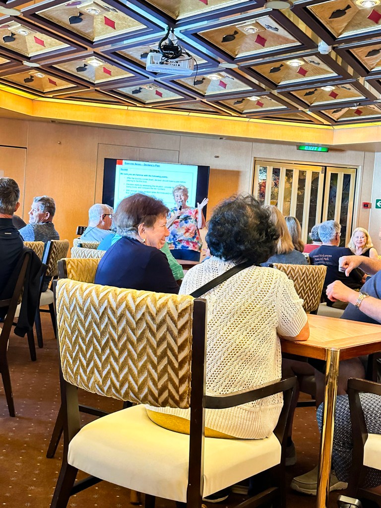 On day 1 of the cruise, I saw that Bridge lessons were available. Jenna and I decided to try it. OMG! The teacher was amazing. The first few lessons were easy then reality hit. Wow, if you play Bridge then you understand. The game is filled with code for what you are bidding, and then there is a dummy hand. We persevered. Every sea day we devoted a couple of hours to learning Bridge. We downloaded 2 tutorial apps on our phones so we could practice. We are now playing with the intermediate players. They are very kind to us and are helping to mentor and guide us. It’s been a blast. We are sad because our teacher is getting off the cruise ship in Sydney, Australia. Jenna and I are thinking of trying to find a Bridge Club when we get home. You’ll notice the pictures are of the lessons that’s because when we play it’s hard to take photos when you are trying to figure out how to respond to a “2 no trump” bid.