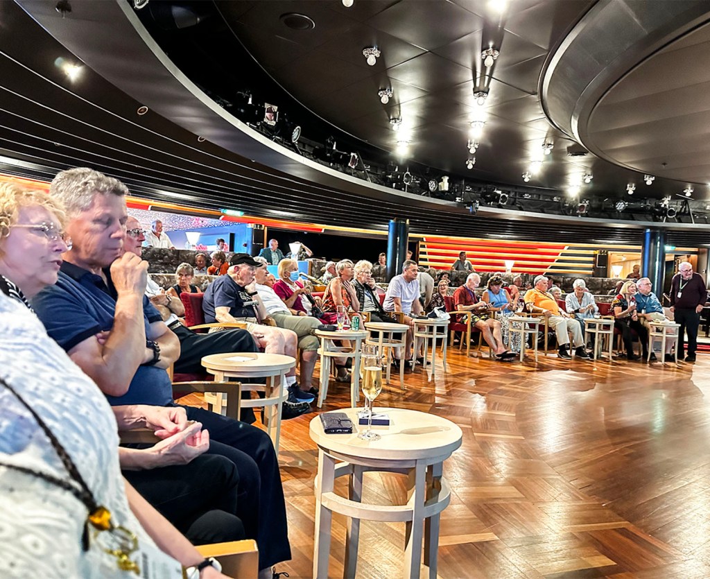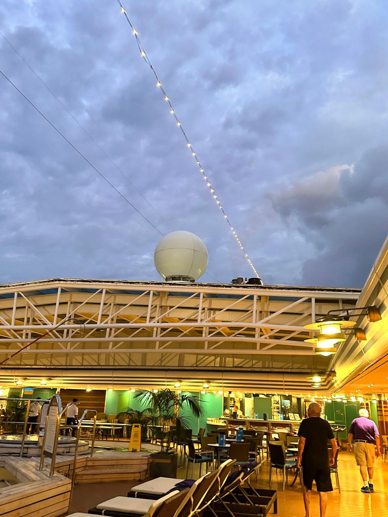 Here are some basic facts about the Noordam. It was built in 2006 and refurbished in 2017. It can carry 1,924 passengers with approximately 800 crew. The length is 936 ft and 105.4 ft in width. It is a Vista Class ship made by the Fincantieri Shipbuilding Co in Trieste, Italy. It has several dining areas, a fitness center, a casino, several bars, a large main stage for entertainers, shops, pickleball courts, and 2 pools, one of which has a retractable roof. Our favorite place is the Crows Nest on the 10th deck, which we call “10 Forward”. If you are not a Star Trek Next Generation fan “10 Forward” is the bar lounge area on the Starship Enterprise in the Next Generation Series. The views are spectacular with its wall of windows. You can enjoy this view in comfort even when the weather outside is either too hot or cold or rainy.