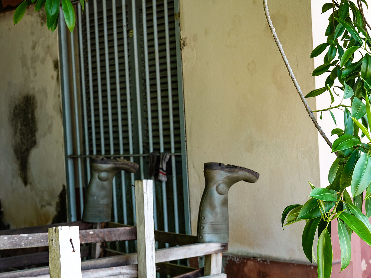 • Boots drying on an old wooden structure.