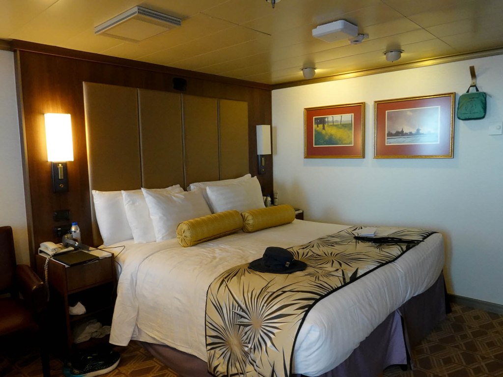 A couple of days into the voyage, we returned to our cabin to find a bunch of gifts on our bed. We each received a tote bag, messenger bag, portable charger, hats and a credit card holder.   The phrase “Zuiderdam Grand World Voyage” is printed on everything including the daily bulletin of events. Steve bought a tee-shirt with the route and ports of call listed on the back.