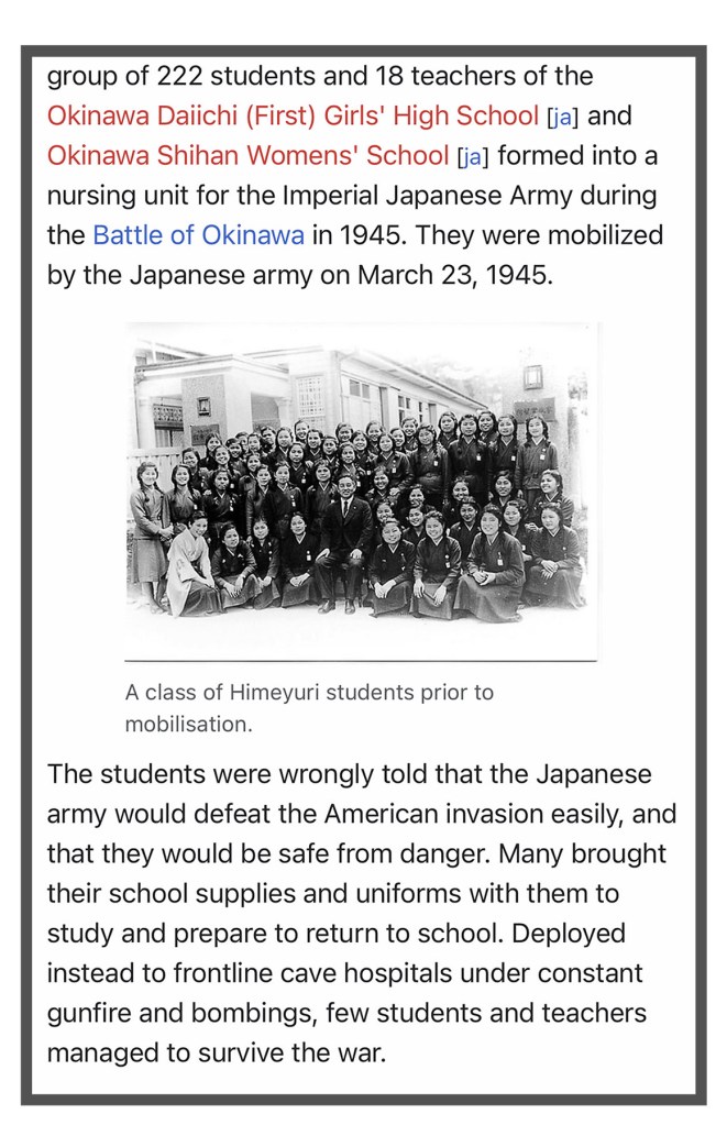 Himeyuri is the site of a former all-girls school that was dedicated to teaching them to become teachers. When the war came to Okinawa, they were conscripted by the military to be nurses. These young girls were taken into caves near the front lines to nurse the wounded soldiers. They faced the hardship and horrors of battle. Food was scarce, often only 1 scoop of rice which had to be shared with the patients. Their role in surgery was to hold the patients down while limbs were amputated without anesthesia.
