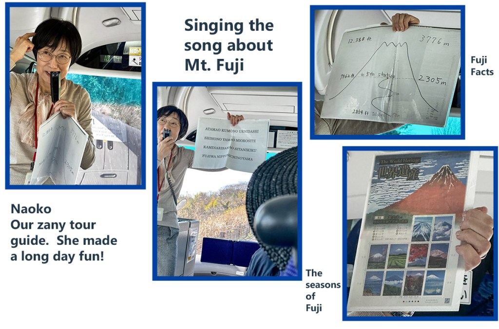 Only about 30% of the tours to Mt. Fuji get a clear day. We could hardly believe our luck, we were among the lucky few. First a few facts about Mt. Fuji. It’s 3,776 meters (12,388 ft). One of Japan’s 3 sacred mountains. In the summer, people hike to the top. The crater at the top is often referred to as representing a woman’s body and is therefore referred to as “she”. Japanese refer to it as Fuji-san. Our tour guide, Naoko taught us a song about Fuji-san. We sang it on the bus. Surprisingly we sounded pretty good. The song pays tribute to how she looks out over the clouds and stares down on the surrounding lands.