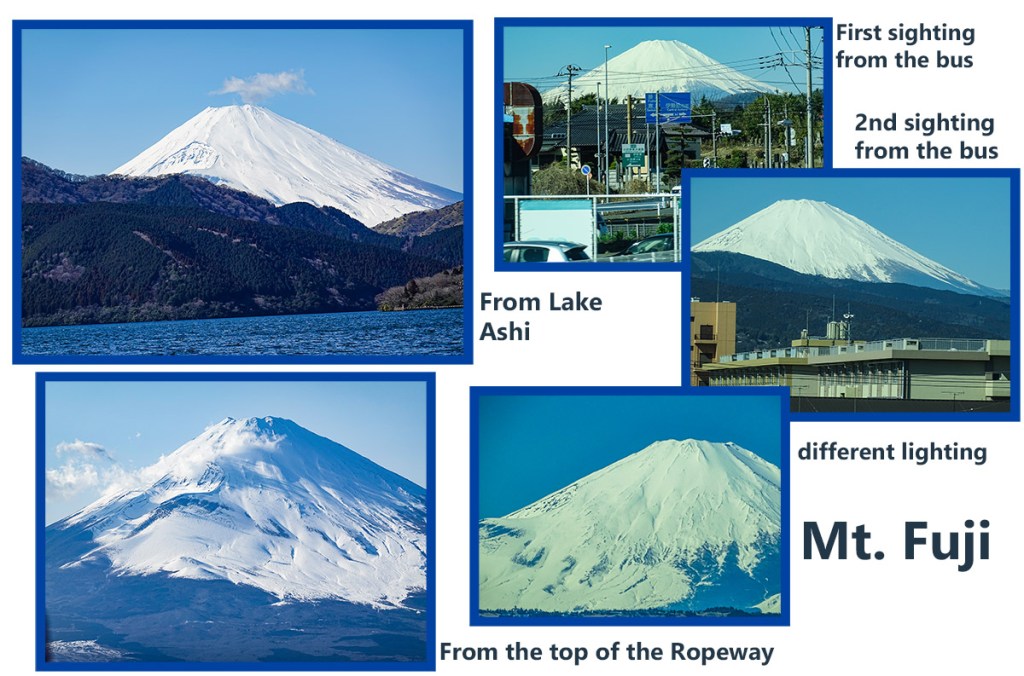 It was quite a long bus ride ( 90 minutes) to get to the viewing area in the Hakone resort area. On the bus every time Mt. Fuji came into view all conversation stopped including the narration from the tour guide. She was as excited as we were. Then you heard “click” “click” “click” of the cameras.