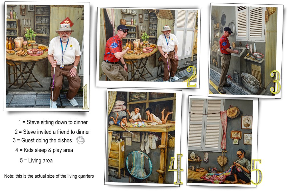 Entering the shopping area of Chinatown we saw a lot of small shops and street food vendors. Our tour guide took us past all that and led us to a unique alley. The murals on the wall were the exact size of the living quarters where 2 or 3 families would live. There was only one kitchen and eating space. Our guide challenged us to pretend we were eating at the table. It was a blast.