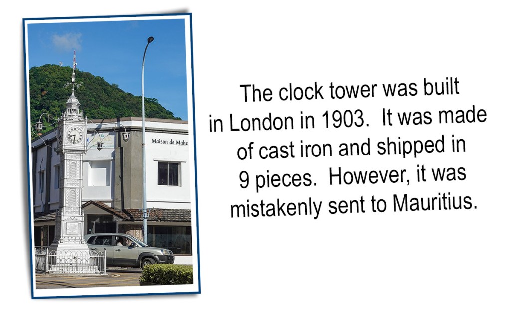 Mahe is one of 115 islands in the Seychelles. The capital city of Victoria is located on Mahe. It also has the distinction of being the smallest capital city in the world. Mahe has approximately 25,500 people with about 8,500 living in the capital. One of the first sights you see in Victoria is the clock tower which goes back to the ties with the United Kingdom. I put a map of the location of the Seychelles in this blog. It seems the UK needed this map when they shipped the clock. As you can see it did finally arrive in Victoria.