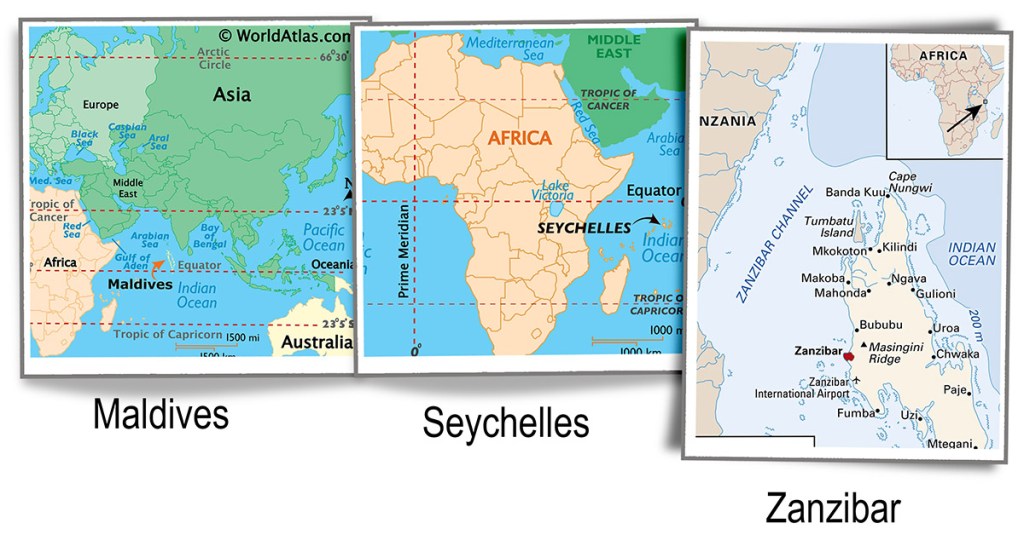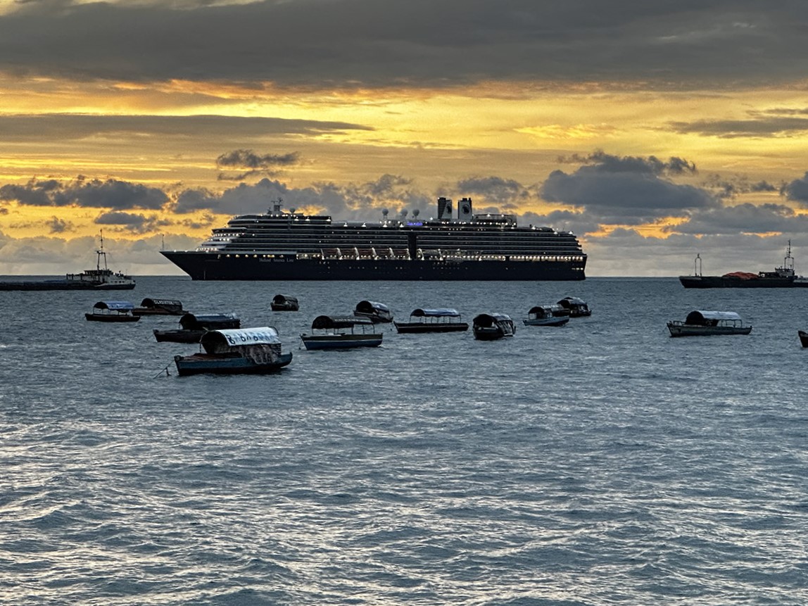 We are now on the revised route since going through the Suez Canal is not a safe route, especially for a ship with the word “America” written prominently on the hull. The next three ports Male, Maldives; Victoria, Seychelles; and Zanzibar, Tanzania are located near the equator. No way to avoid the heat and humidity.